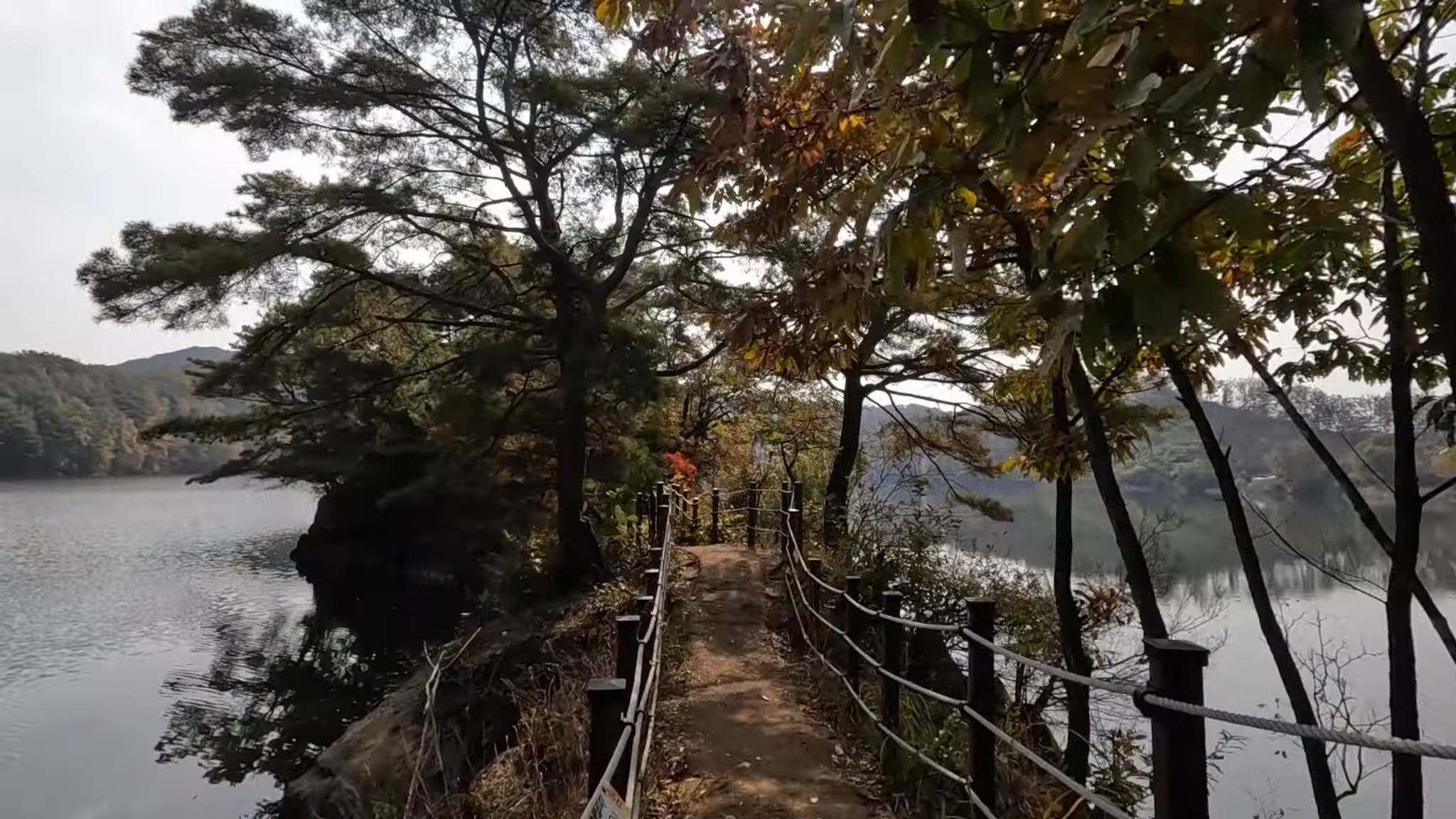 - 호반 잔도 둘레길: 대청호와 나뭇가지의 알록달록한 단풍이 어우러진 가을 풍광. 영상: “만추의 가을이 완연, 편안한 산책길 느낌.”